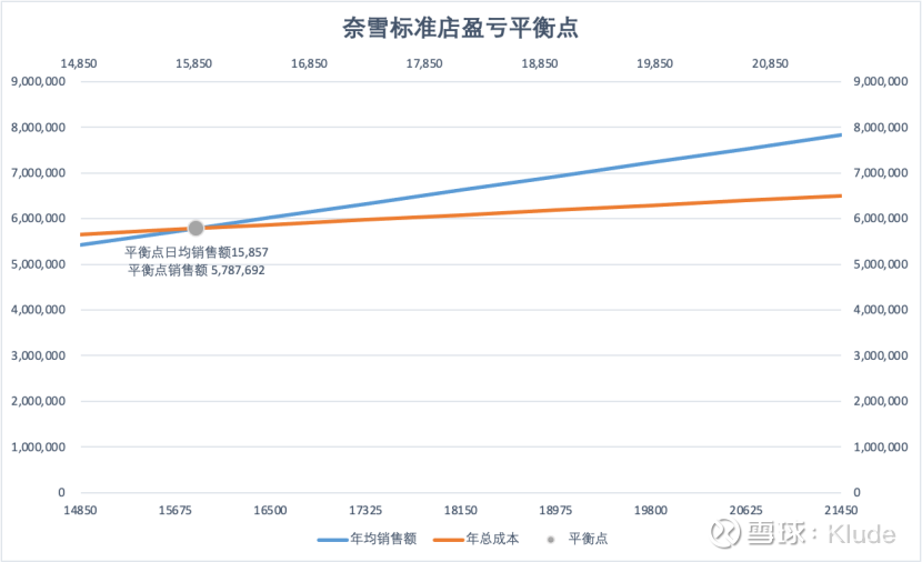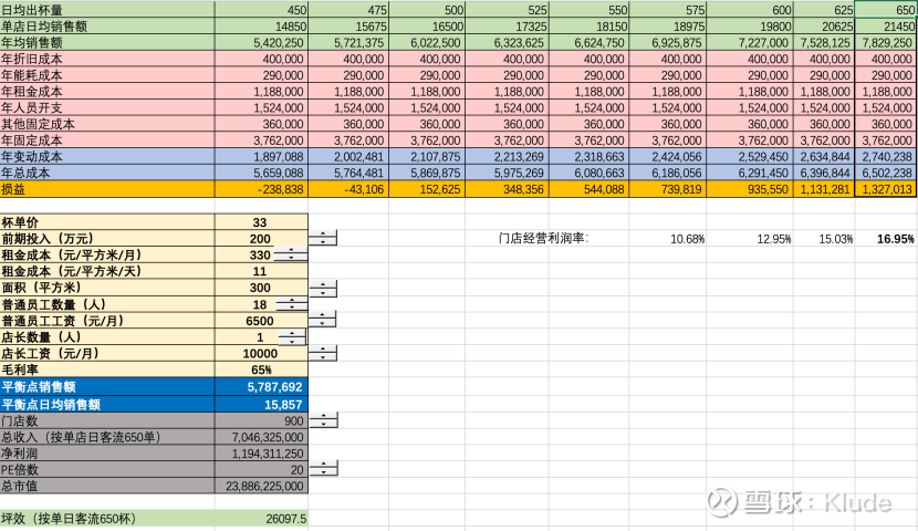 奈雪的模型没有迭代的必要了,感兴趣可以去表格里进行查阅。固定成本高得吓人,总成本曲线的截距很高,盈亏平衡点靠后。按照33 的客单价,11元/平·天的租金,250平的商场一楼大店,18个员工,每天卖1万5才能回本,需要每天卖450多杯。