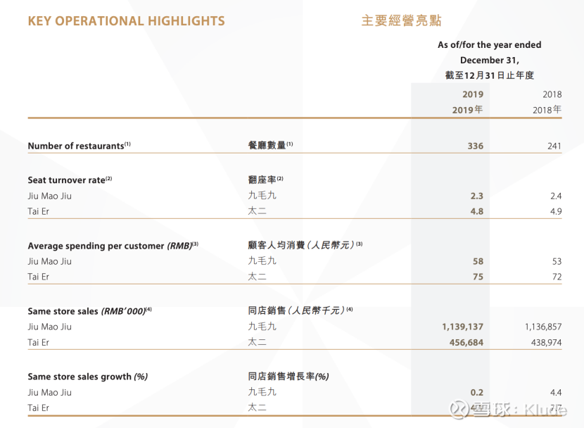 再聊聊九毛九。太二当年的势能很强,第一次吃太二排队排了两个小时,而且不让四个人以上坐一桌,我们当时五个人一块,被迫分两桌吃,点了两份鱼,非常傲娇。2019年的巅峰期,太二的客单价还能提升,翻台率4.8。