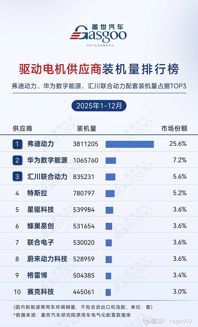 从盖世汽车2025年1-12月装机量数据来看,比亚迪通过旗下半导体、弗迪系子公司,在新能源汽车电气化全产业链实现了全面领跑,几乎覆盖所有核心环节并占据头部位置,是当之无愧的全产业链龙头。