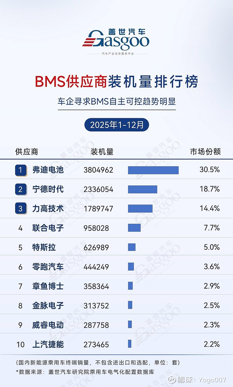 • BMS(电池管理系统):弗迪电池以380万套、30.5%份额位居第一,远超第二名宁德时代(18.7%),车企自主可控趋势下,比亚迪系优势进一步扩大。