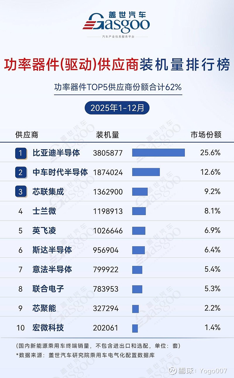 功率器件(驱动):比亚迪半导体以380万套、25.6%份额位居第一,TOP5供应商合计份额仅62%,比亚迪一家独占近四成。