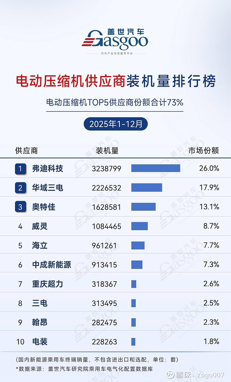 • 电动压缩机:弗迪科技以323万套、26%份额登顶,TOP5合计份额73%,比亚迪系是绝对核心。
