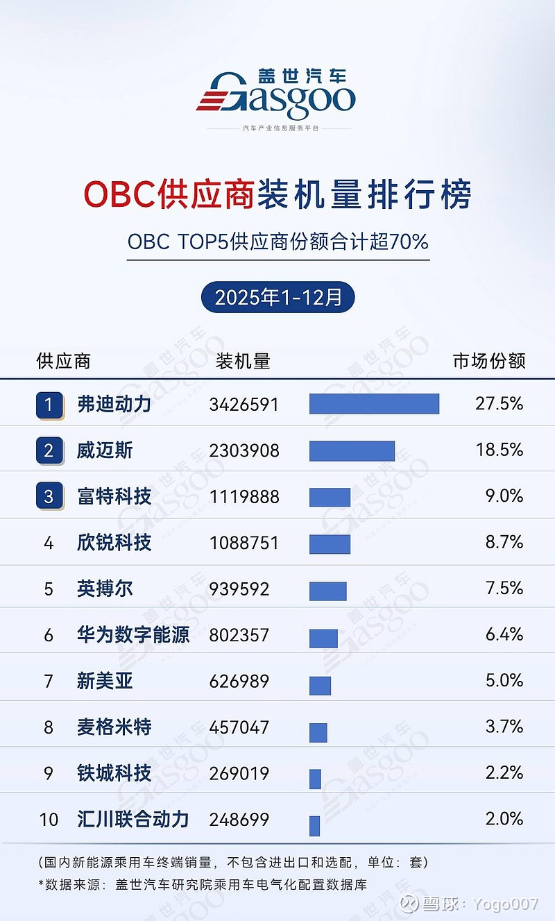 • OBC(车载充电机):弗迪动力以342万套、27.5%份额位居第一,TOP5合计份额超70%,比亚迪系领跑行业。