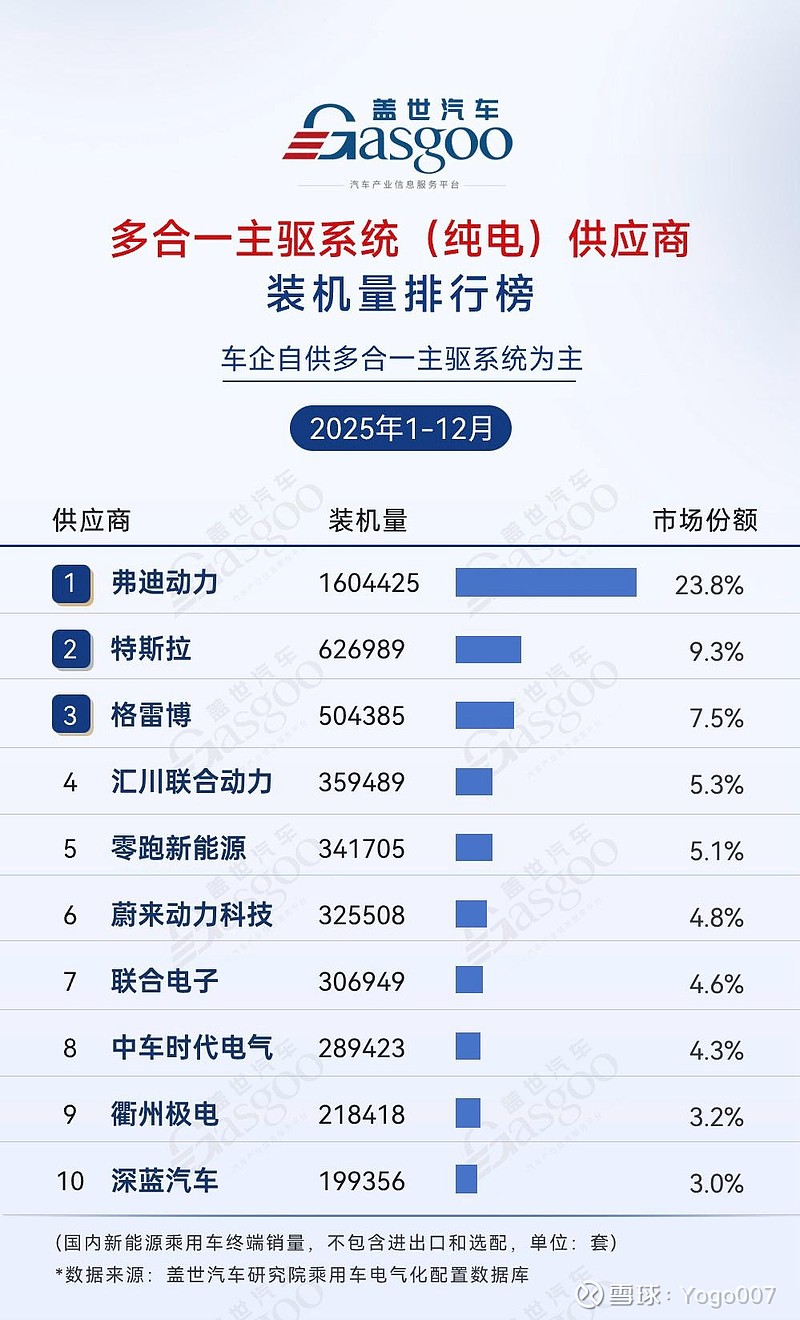 • 多合一主驱系统:弗迪动力以160万套、23.8%份额位居第一,车企自供为主的格局中,比亚迪系是最大玩家。