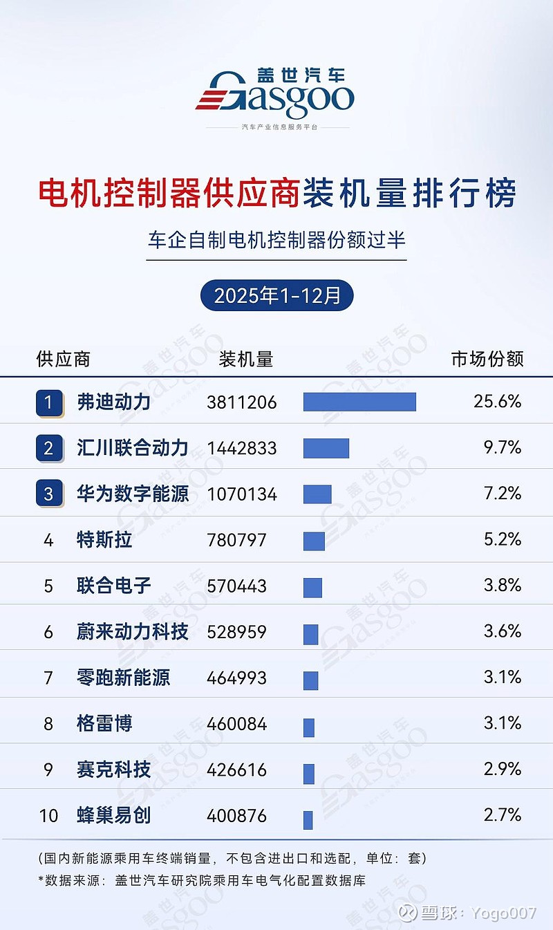 • 驱动电机/电机控制器:弗迪动力双榜第一,装机量均达381万套,份额25.6%,在电机控制器榜单中,车企自制份额过半,比亚迪系牢牢占据核心位置。