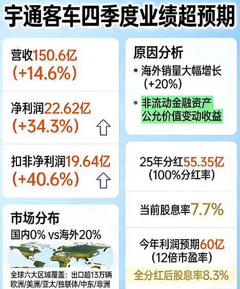 宇通客车四季度营收150.6e,同比增长14.6%,净利润22.62e,同比增长34.3%,扣非净利润19.64e,同比增长40.6%,业绩超预期。