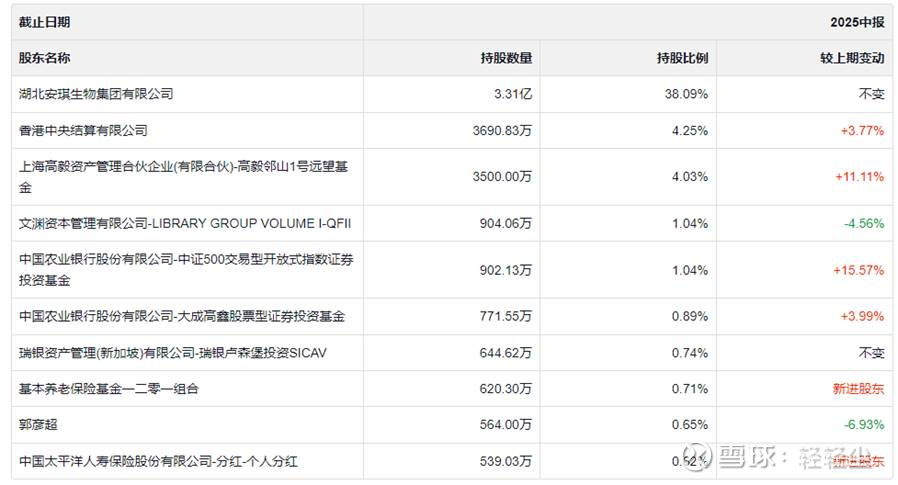 根据2025年半年报数据,公司控股股东是湖北安琪生物集团有限公司,持股比例为38.09%,实控人为宜昌市国资委。其他十大股东中涵盖了外资、公募基金、保险、养老金等各类机构投资者,并且多数在今年二季度都有增持动作,体现出机构对公司长期价值的认可。