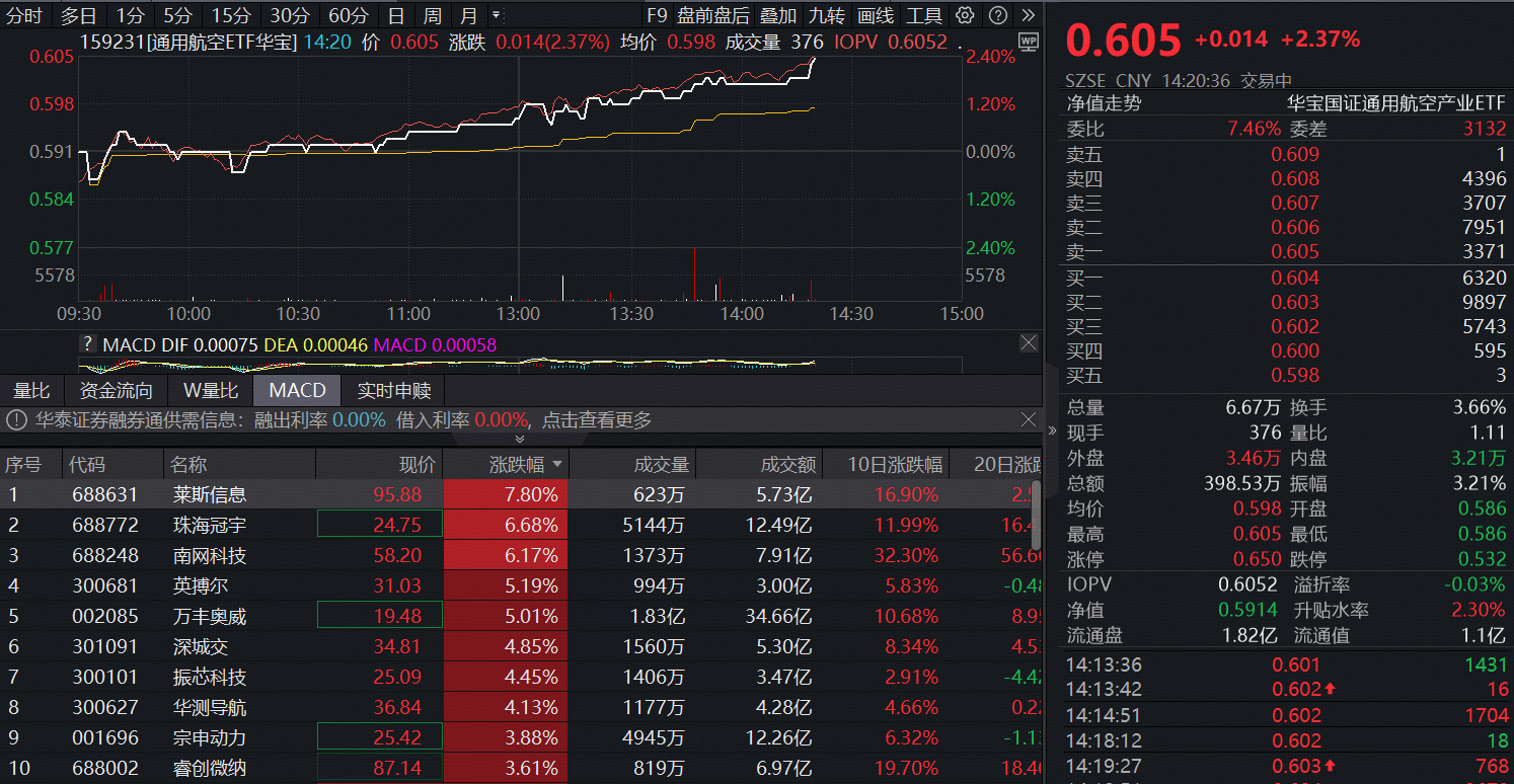 9月24日午后,低空经济概念持续走强,莱斯信息涨超7%,珠海冠宇、南网科技涨超6%,英搏尔、万丰奥威涨超5%。一键布局低空经济+大飞机+军民融合+商业航天的通用航空ETF华宝(159231)场内价格现涨2.37%。