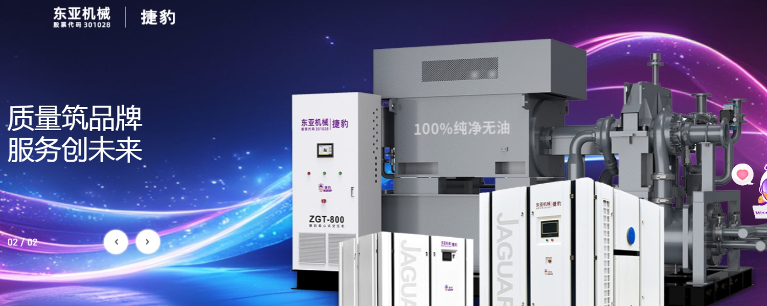 答:厦门东亚机械工业股份有限公司以压缩机、真空泵主机自主研发设计、生产为核心,并进行压缩机、真空泵整机以及配套设备的研发、生产与销售。公司主要产品包括螺杆式空压机、无油螺杆机、螺杆真空泵、离心式压缩机等,广泛应用于新能源、半导体、电子、机械制造、化工、医药、食品等行业。经过近 30 年的发展,公司旗下 “捷豹 JAGUAR”品牌已成为业内知名品牌。公司已成为国内永磁变频螺杆空压机领域的龙头企业。在国内螺杆空压机市场,东亚机械市场份额约 10.7%,在永磁螺杆机细分领域常年占据全国领先地位。在国内高端螺杆机市场占有率约 15%,在移动式螺杆空压机市场份额约 5.2%,单螺杆式空压机市场份