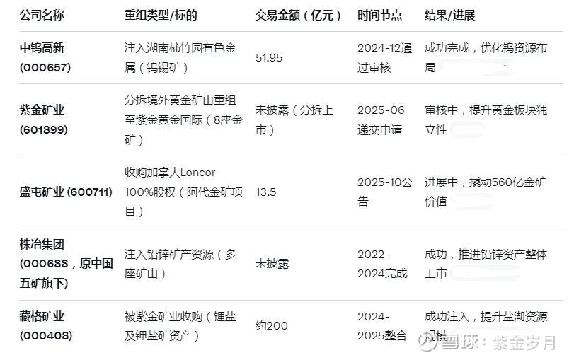 2024-2025年部分成功或进展中的矿业重组案例(排除国城矿业),聚焦有色金属、黄金、铅锌等矿产注入/收购。数据基于公开公告,旨在展示类似战略转型路径。