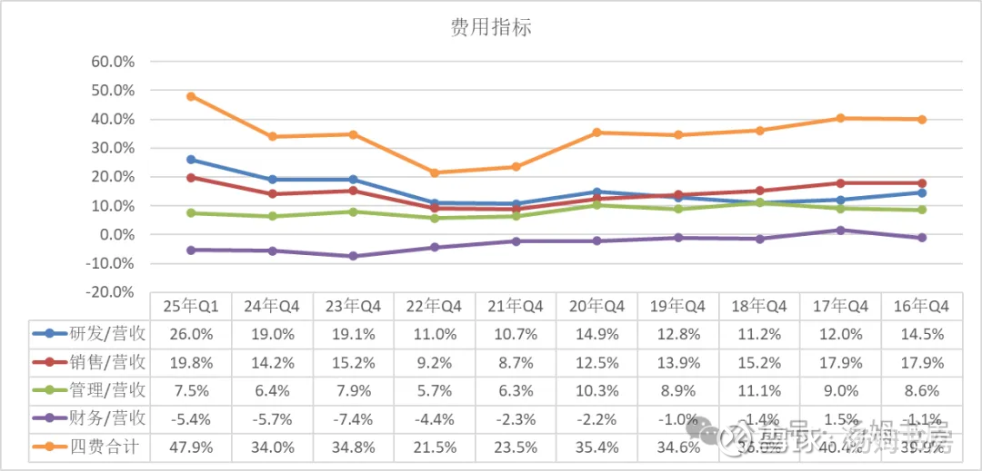 费用指标:四项费用管控较差,2024年34%偏高,研发费用最高,且历年一直在增长,公司对研发投入非常重视,其次到销售费用,在上市后逐年增长。