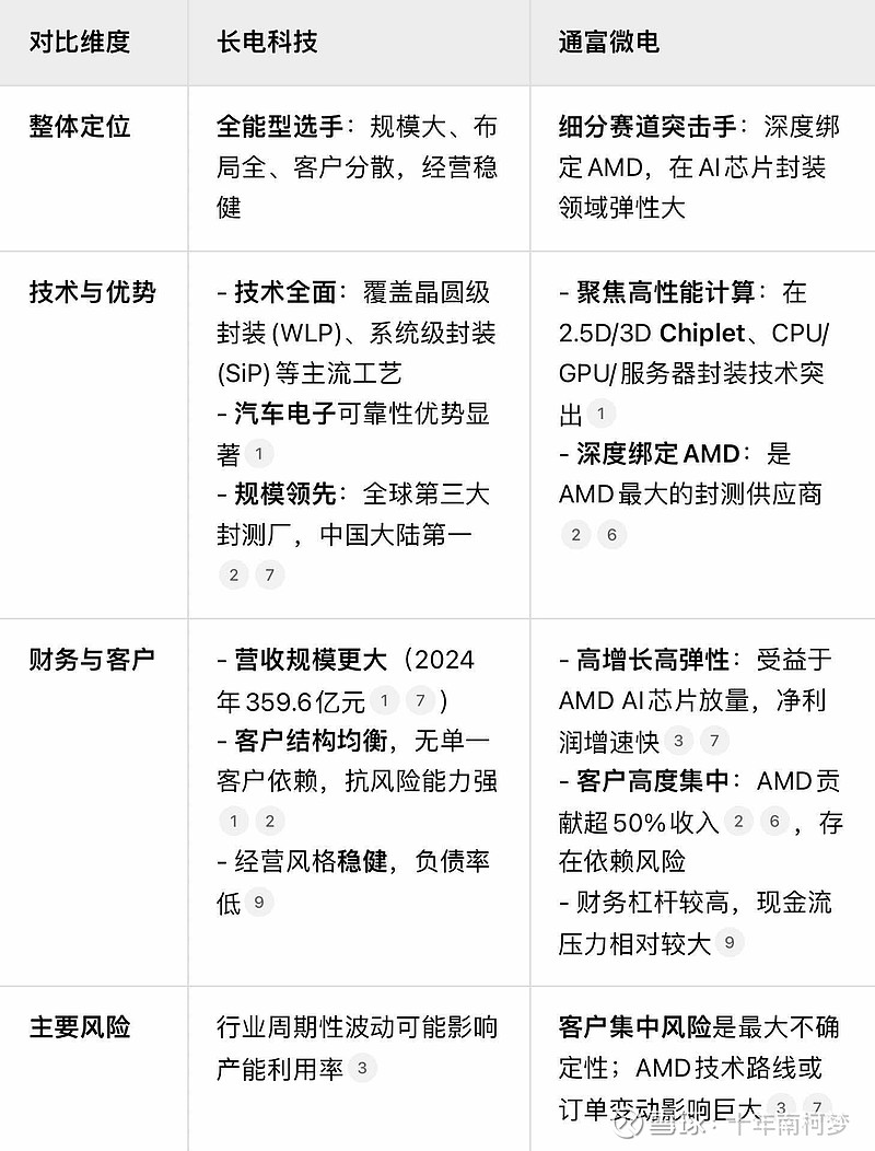 我打算用表格形式直观展示这些对比数据,然后针对不同投资偏好的用户给出具体建议。对于稳健型投资者,长电科技可能是更合适的选择;而对于愿意承担更高风险追求增长的投资者,通富微电可能更有吸引力。最后我会提醒用户注意半导体行业的周期性和技术风险。
