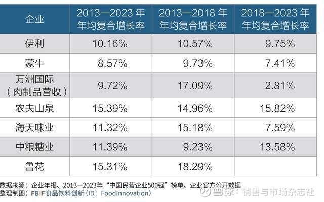 伊利、蒙牛、万洲国际(肉制品营收)、海天味业这4家企业在2013—2018年增长更为迅速,它们属于先发调整型。如伊利、蒙牛在2015年前后完成渠道下沉,增长引擎切换至高端化为其带来了收入的高速增长。