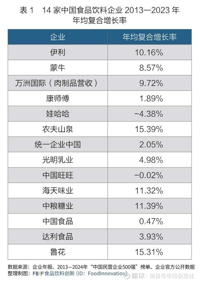 我们引入了年均复合增长率这一指标来观察这14家中国食品饮料巨头企业在2013—2024年的增长情况。