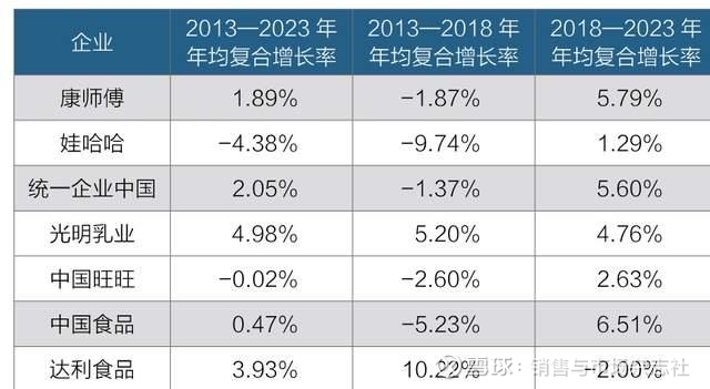 复苏型:康师傅、娃哈哈、统一企业中国、光明乳业、中国旺旺、中国食品、达利食品,这7家企业10年年均复合增长率低于平均值(见表3)。