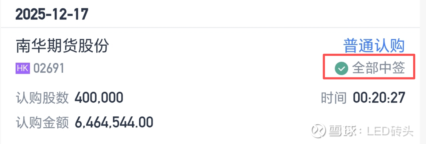 时间来到了2025年12月17日,南华期货开始打新。在这之前,特意查询了南华期货的A股股价,当日收盘19.43元,折后港币21.48元,而港股发行价12港元,折价率44%。而南华期货2025年前3季度9.4亿营收,3.5亿净利润,净利率37.41%。而且从事境外期货业务,境外 16 个交易所会员 + 15 个清算席位,先发壁垒高。怎么看,公司都不差。