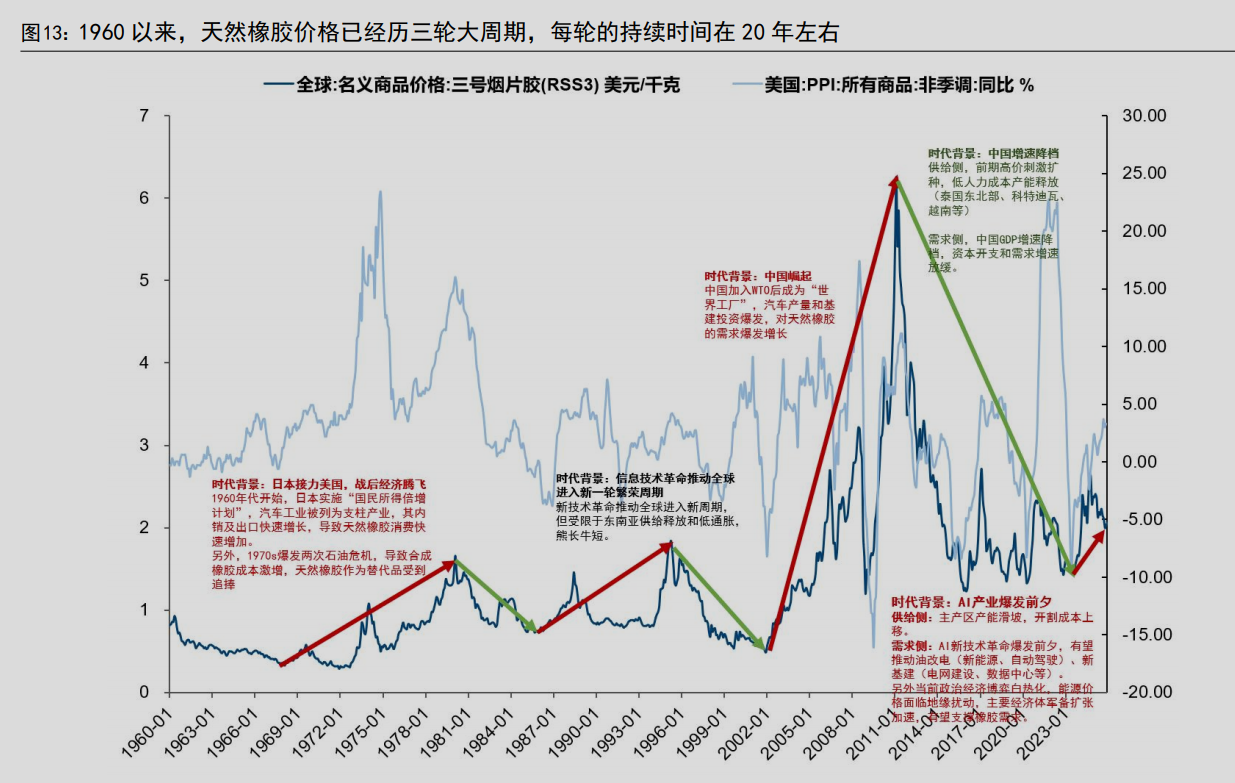 天然橡胶20年一轮大周期,原因是橡胶树10年左右才进入旺产期。产能变量要和宏观经济配合才能打出高度。现在天然橡胶价格从2023年5月以来基本确认长周期拐点。借助GEMINI,简单分析下过去几轮大周期的成因: