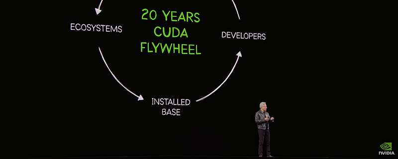 今年 GTC 有一个很特殊的节点——CUDA 二十周年。老黄开场花了将近十分钟讲 CUDA 的演进,他自己说真正难以复制的壁垒就是底层的安装基数。然后他讲了那个飞轮效应:安装基数吸引开发者,开发者用 CUDA 做出突破——比如深度学习——突破催生新市场,新市场带来更多公司和用户,安装基数继续膨胀。他说六年前出货的 Ampere 架构,现在在云上的租用价格反而在涨——因为 CUDA 生态让它的应用场景越来越多,生命周期越来越长。这就是飞轮在转的证据。