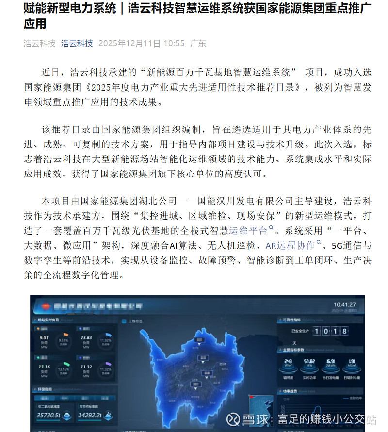 $浩云科技(SZ300448)$ 浩云科技承建的“新能源百万千瓦基地智慧运维系统” 项目,成功入选国家能源集团《2025年度电力产业重大先进适用性技术推荐目录》,被列为智慧发电领域重点推广应用的技术成果。本项目由国家能源集团湖北公司——国能汉川发电有限公司主导建设,浩云科技作为技术承建方,围绕“集控进城、区域维检、现场安保”的新型运维模式,打造了一套覆盖百万千瓦级光伏基地的全栈式智慧运维平台。系统采用“一平台、大数据、微应用”架构,深度融合AI算法、无人机巡检、AR远程协作、5G通信与数字孪生等前沿技术,实现从设备监控、故障预警、智能诊断到工单闭环、生产决策的全流程数字化管理。