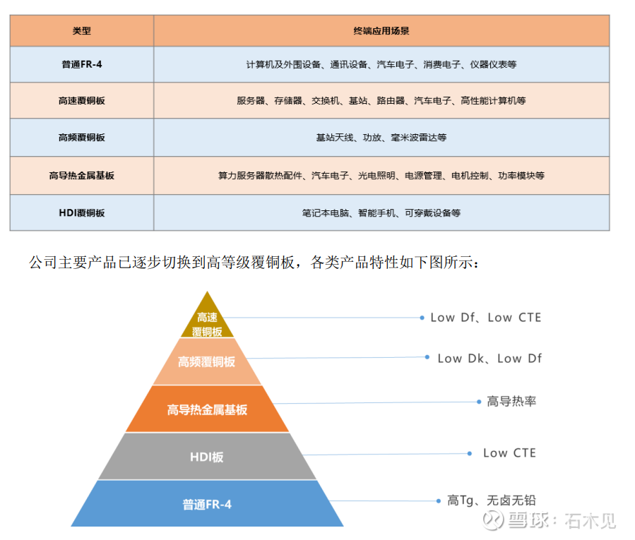 6、公司致力于技术的开发与迭代,覆铜板在实现“三高(高频、高速、高导热)”特性的同时,进一步推进“三低(Low Dk、Low Df、Low CTE)”技术指标的纵深发展。覆铜板产品的下游应用领域众多且有不同功能化需求,公司覆铜板产品分类如下: