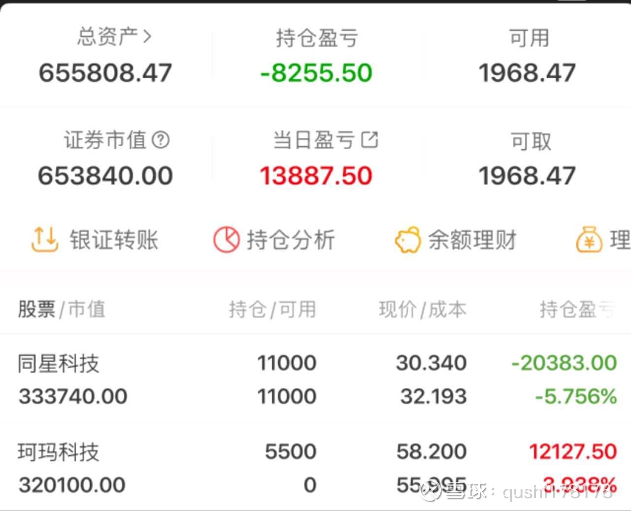 50万到500万第13天,账户资金:655808。买入柯玛科技,继续持有同星科技。同星科技还是比较弱,不过已经企稳,先不动,看周一反弹情况再定。半导体非常强势,希望柯玛科技不要让我失望,周一再来个大涨#股票# #实盘分享# #财经#
