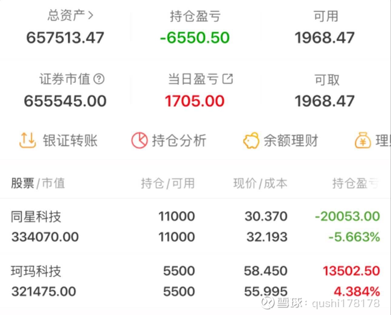 50万到500万第14天。账户资金:657513。继续持有同星科技和珂玛科技。今天大盘大涨,但是手里的票还是有点弱,盘中也有跳水。因为看好的票一大早就上去了,就没有换,继续持有。#实盘分享# #财经# #股票#