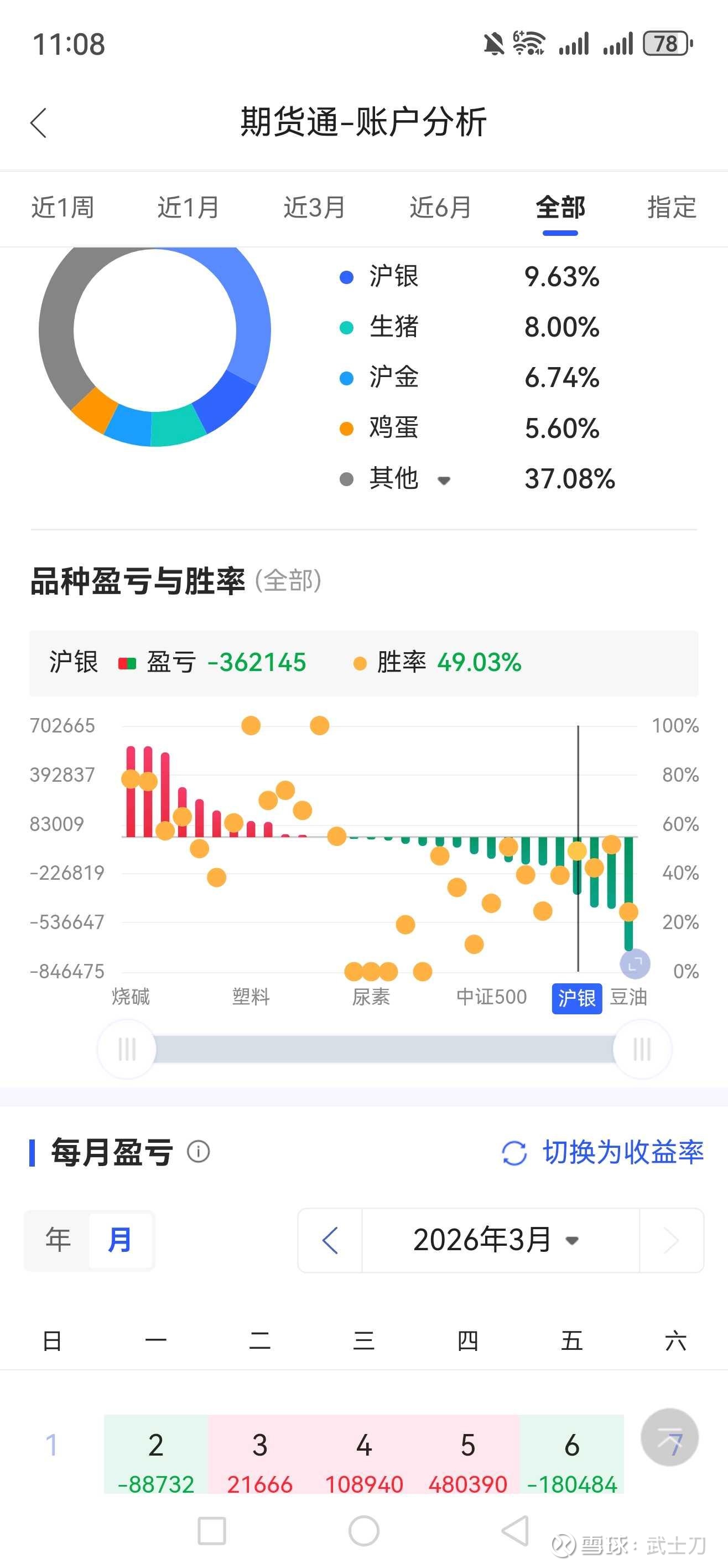 白银期货亏36万,黄金期货亏6万。黄金期权四次,一次亏10万,一次亏8万,一次亏30万,最后一次赢100万。
