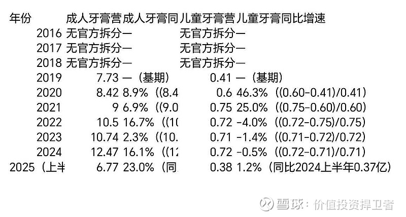 成人牙膏2020—2024营收增速从9%-16%,且2025年加大增速,而儿童牙膏从46%— -0.5%,且2025年还在加大负增长。