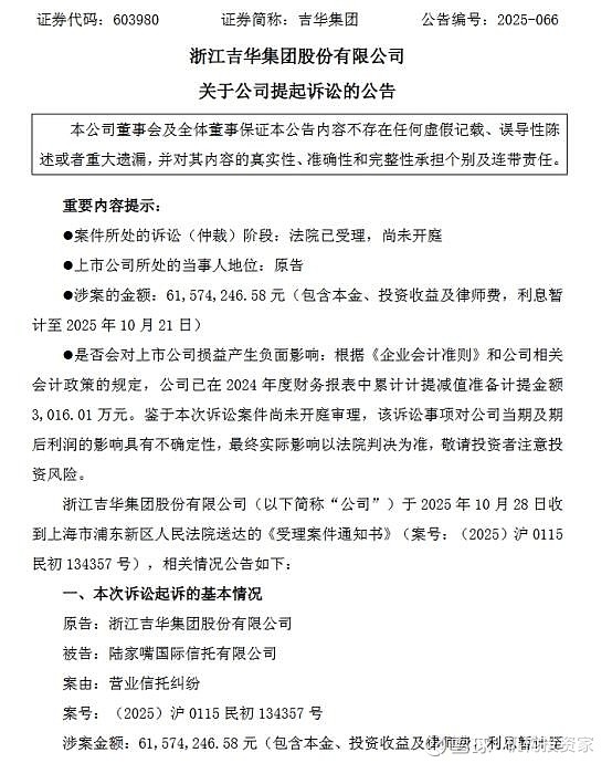 近日,浙江吉华集团股份有限公司发布公告,因信托产品兑付纠纷,已就“陆家嘴信托-华鼎18号集合资金信托计划(简称“华鼎18号”)”相关事宜,向上海市浦东新区人民法院起诉陆家嘴国际信托有限公司,涉案金额达6157.42万元(含本金、投资收益、律师费,利息暂计至2025年10月21日),目前法院已受理但未开庭。