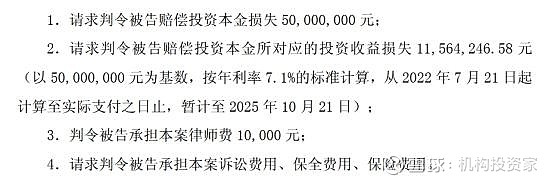 吉华集团本次诉讼请求包括:判令被告赔偿投资本金损失5000万元;赔偿以5000万元为基数、按年利率7.1%标准计算的投资收益损失(暂计至2025年10月21日为1156.42万元);承担律师费1万元;以及承担本案诉讼费用、保全费用、保险费用等。