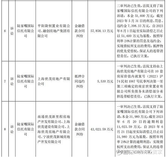 此外,陆家嘴信托多款信托计划也被曝出问题。2025年4月18日,上海陆家嘴金融贸易区开发股份有限公司发布“关于公司及控股子公司涉及诉讼的进展公告”。其中:陆家嘴信托涉诉案件6起,涉及规模高达约32.43亿元。