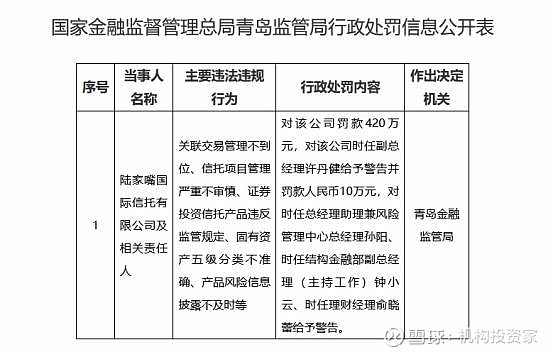 合规方面,陆家嘴信托近年屡次暴露内控漏洞。2025年6月,公司因关联交易管理不到位、信托项目管理不审慎、证券投资业务违规等多项问题,被国家金融监督管理总局青岛监管局处以420万元罚款,相关责任人也受到处罚。此前在2024年,公司已累计收到3张监管罚单。