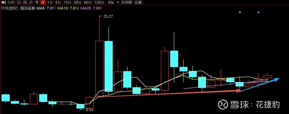 国元证券年线超级支撑线上起步,年线3连涨,9.5%、22.5%、7.8%,都是小涨,累计涨幅仅44.7%。