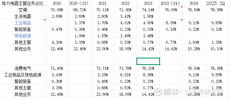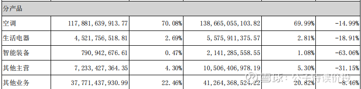 格力业务收入:空调、生活电器、智能装备、其他主营业务及其他业务。其中空调占有70%,生活电器2.69%,智能装备才0.47%,其余全部来自其他业务了,占了格力营收的26%。