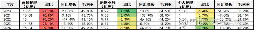 个人护理:持续萎缩,2024年收入较2020年下降51%,主因竞争加剧及公司战略收缩。