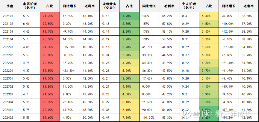 2023年:业绩显著修复,营收+12%,净利润+170%,主因供应链改革、高毛利产品占比提升(家居护理毛利率+3.1pct至45%)及利息收入增加。宠物业务增速放缓至0.5%,但个人护理毛利率提升3.9pct至40.3%。