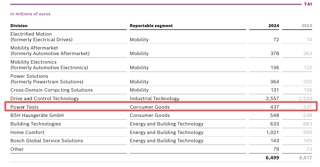 博世旗下电动工具部门主要活跃于欧洲市场,由于博世不是上市公司,我在官网仅找到了2024年报的明细数据,显示其电动工具仅有约1.5%的微弱增长。