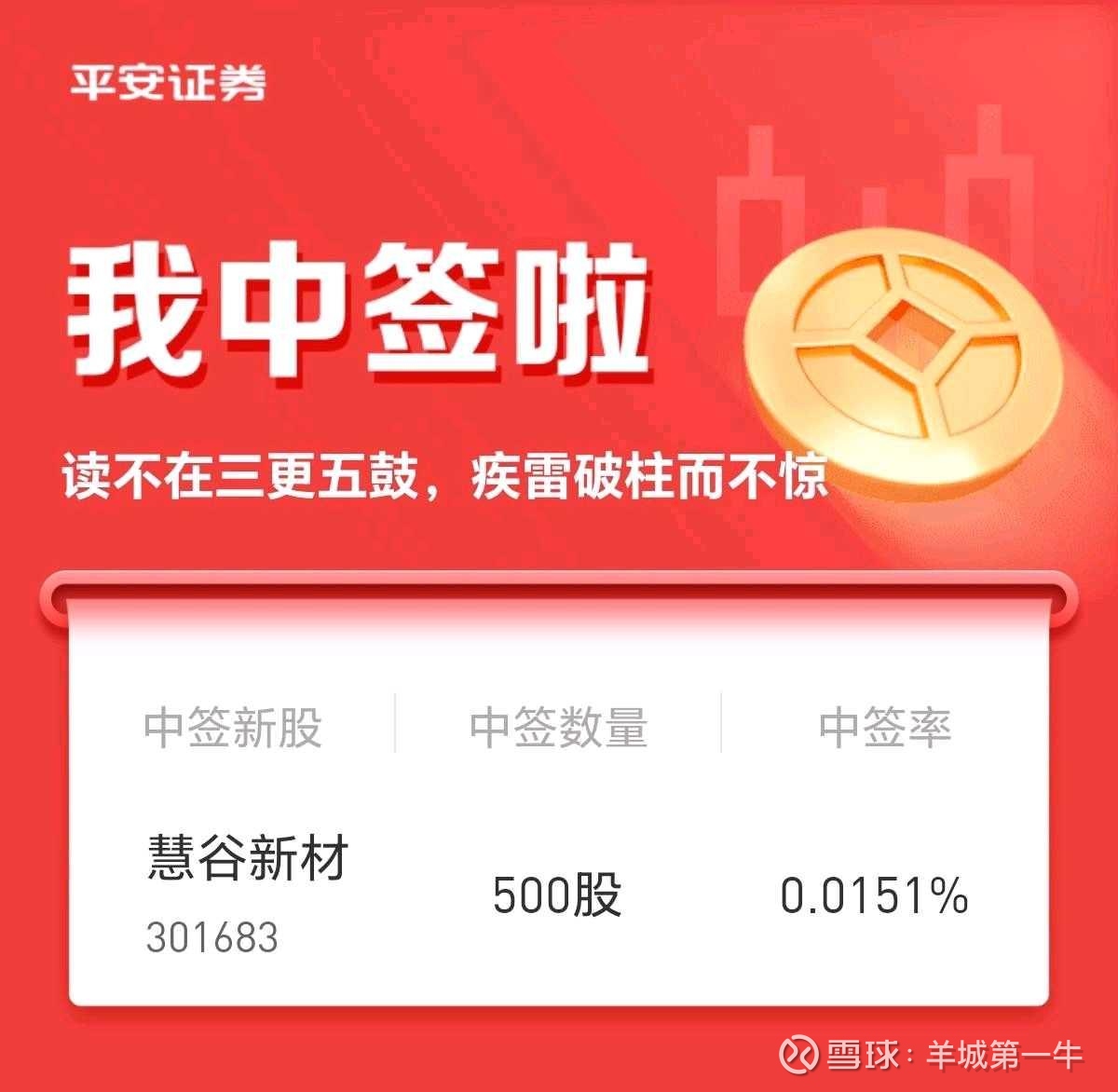最近行情比较让人郁闷,但我现在心情很好,因为平安证券账户又中签了,是高价新股$慧谷新材(SZ301683)$ ,分享给关注我的朋友们,祝大家同样有好运