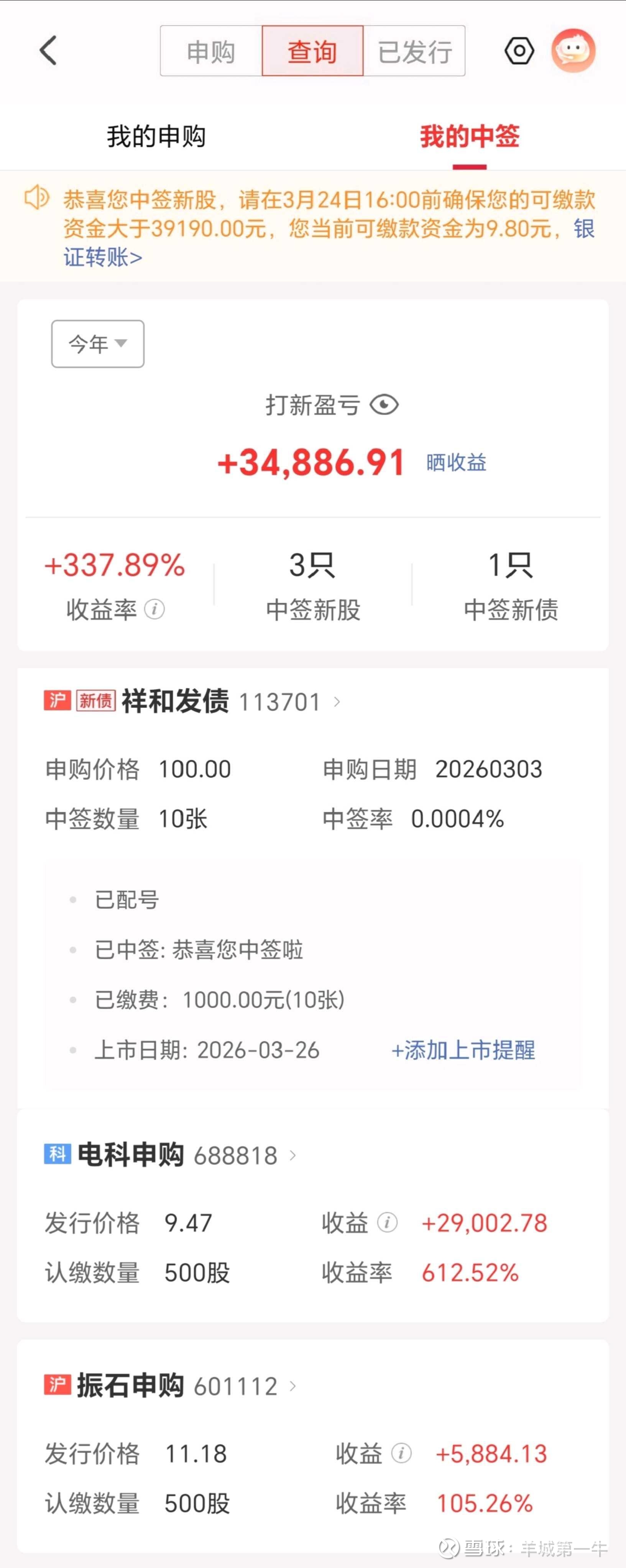 这其实是我今年中签的第三只新股,1月份中了$振石股份(SH601112)$ ,收益近5900元;2月份中了$电科蓝天(SH688818)$ ,收益2.9万元。