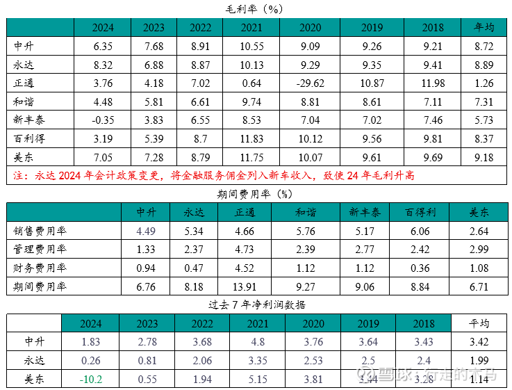 从7年平均ROE/PB的值中升17.97/0.56=32、永达11.46/0.29=39.5、美东20(将2024年净利润修正到-1亿元)/0.96=20.8,永达>中升>美东。