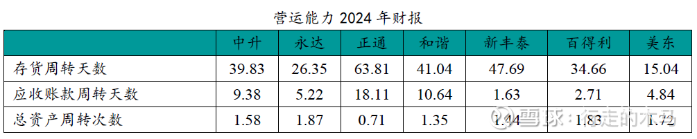 中升的在周转率方面,效率低于永达和美东,在存货和应收账款的周转率方面,低于永达和美东不少。在总资产的周转率方面,劣势则不那么明显。2024年,美东做到了高毛利率、高周转率、低销售费用的不可能三角,但能否持续则有存疑。