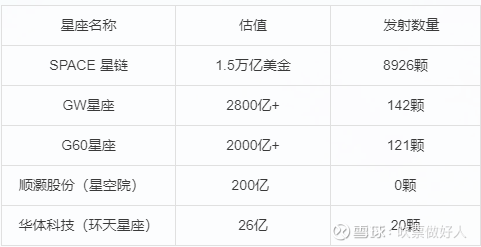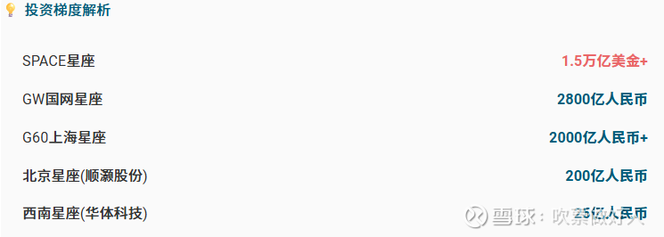 北京星座--顺灏股份 200亿 西南星座--华体科技25亿 G60上海星座--2000亿+ GW国网星座--2800亿+ SPACE星座--1.5万亿美金+