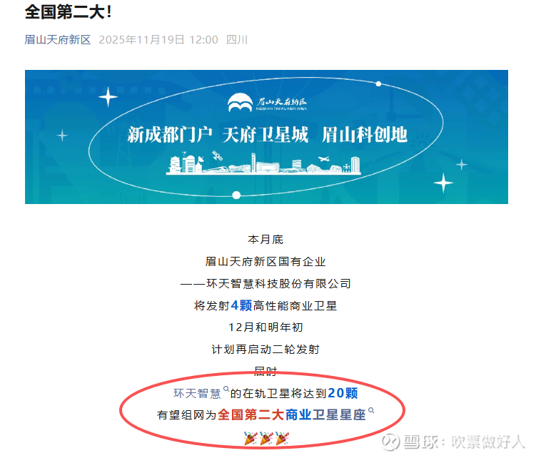 2022年,环天智慧分两次成功发射10颗高分辨率光学卫星,完成“环天星座”第一阶段一期组网任务,眉山商业遥