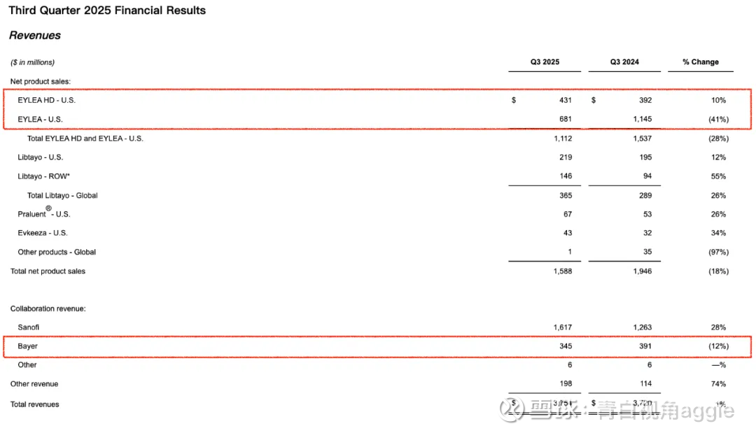 该公司 2025 年第三季度与拜耳在美国以外地区销售 Eylea 两款产品相关的合作收入为 3.448 亿美元,比 2024 年第三季度的 3.908 亿美元下降了 11.7%。