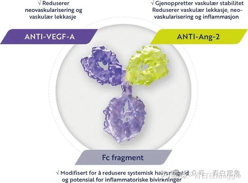 Vabysmo 是首个针对眼科疾病开发的VEGF-A/ANG-2双特异性抗体,主要适应症包括湿性年龄相关黄斑变性和糖尿病黄斑水肿、视网膜静脉阻塞引起的黄斑水肿等。与单纯anti-VEGF疗法相比,其用于治疗多种视网膜疾病可以实现减少眼部注射给药频率。Vabysmo 目前已在美国、英国、日本、欧盟等全球80多个国家和地区获批上市。2023年12月,中国NMPA正式批准法瑞西单抗(商品名罗视佳)用于治疗糖尿病黄斑水肿(DME)。