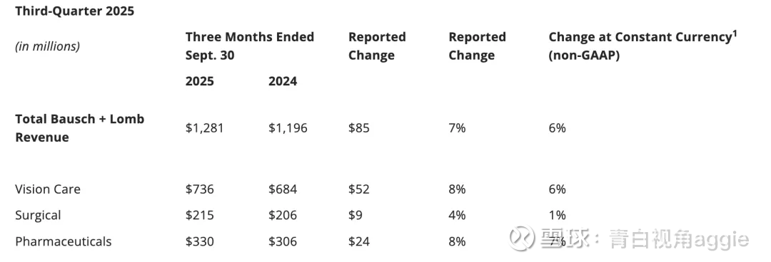 博士伦 10 月 29 日公布,其 2025 年第三季度营收总计 13 亿美元,比 2024 年第三季度的 12 亿美元增长 7%。