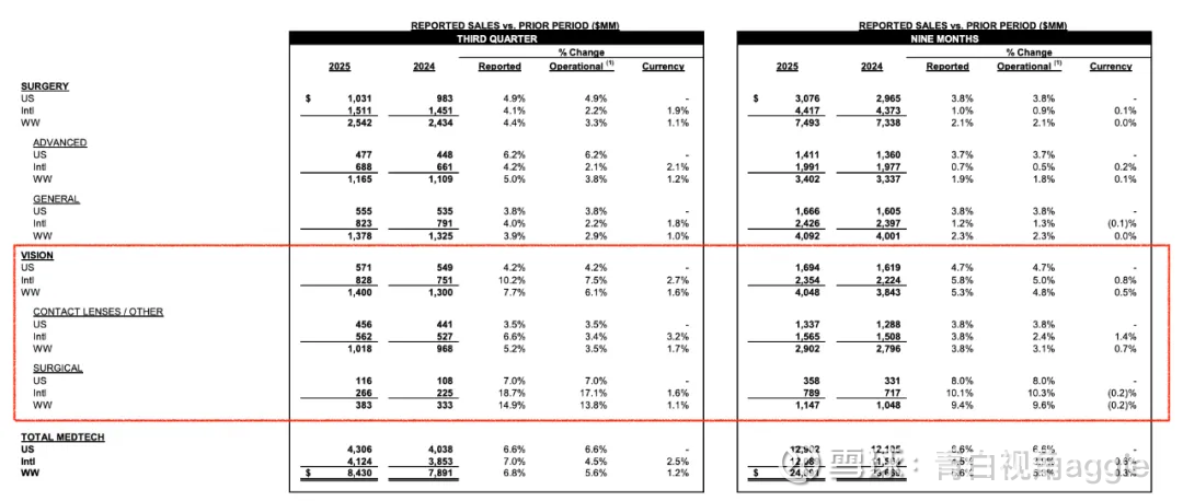强生 10 月 14 日报道称,J&J Vision 2025 年第三季度的全球收入总计 14.00 亿美元,较2024年第三季度的 13.00 亿美元增长7.7%。美国收入同比增长 4.2%,美国境外增长10.2%。