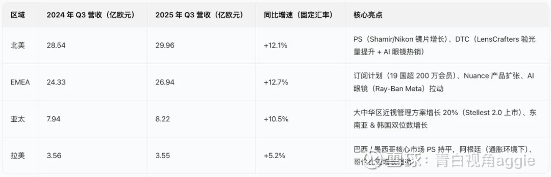 依视路陆逊梯卡 10 月 16 日宣布,2025 年第三季度的综合收入达到 68.67 亿欧元(约79亿美元),同比增长了 11.7%。整体呈现 “季度业绩创历史最佳、全年增长稳健、创新与并购驱动未来” 的特点。从区域来看,北美、欧洲中东及非洲(EMEA)市场表现突出,亚太地区实现稳健增长,拉丁美洲增速有所放缓;从业务来看,专业解决方案与直接面向消费者两大业务板块均实现双位数增长,智能眼镜成为核心增长驱动力。