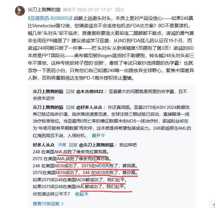 对于第一次看见诺诚的临床几个人数据,本人就提出248是最好的BCL2,大家更多的是冷嘲热讽,本人全部笑纳了,因为对于那些从来不研究机制和临床前数据的人来说,我知道我的研究的深度和他们的区别,创新药最好的地方是,大家最后都是临床数据说法,不管是谁,在临床数据面前全部显出原型。