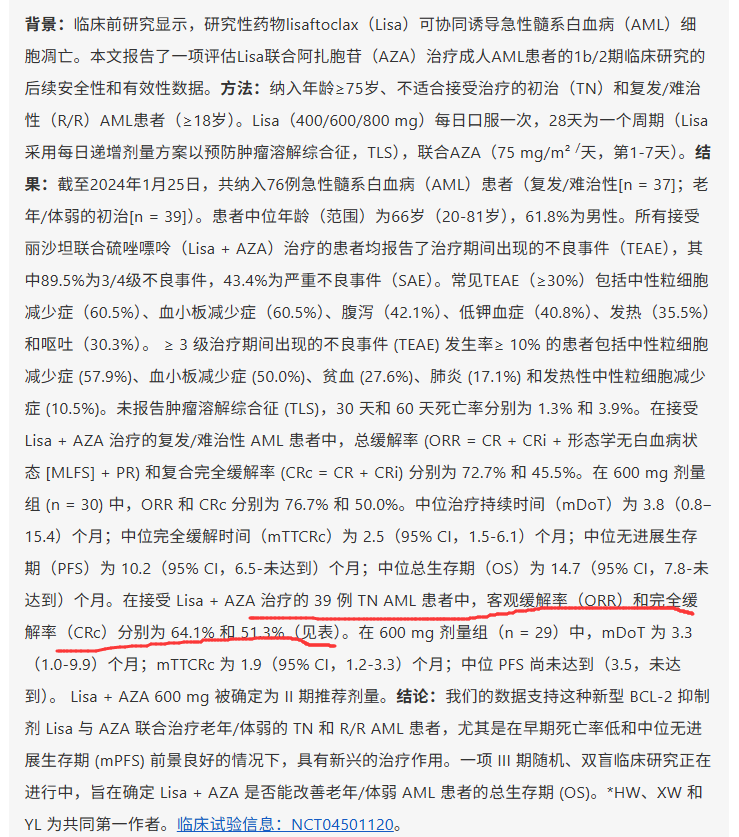 在昨天的关于BCL2的数据对比帖子里面,有人提出说诺诚健华关于ICP-248的关于治疗初治AML的数据,这个朋友提出的数据对比不正确,他说诺诚健华给出来的数据表格里面关于亚盛医药的2575的数据是复发难治的AML数据,其实这个是这个朋友的自己的理解错误,文件写的非常清楚,文章来自什么地方,出处在那里,只要这位朋友自己去打开链接就可以看见这个数据。 亚盛医药的关于2575的治疗初治的AML的数据就是39人,CR率就是51.3%,SAE就是43.3%,数据没有任何问题。图片小字的2写的非常清楚来自于2024 ASCO会议摘要。数据自己怎么说是一回事情,就怕对比。好就是好,不好就是不好。